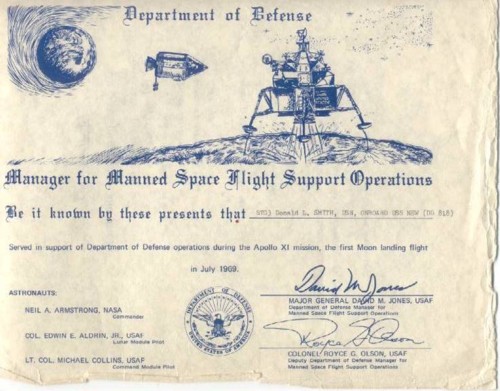 to stay on station until the missions were complete. It is still exciting to think you were a small part of these historic events. We were in Houston Tx last year visiting friends and their grandson was studying Apollo XI and they had to interview three people to see if they could remember what they were doing when man first walked on the moon. He got an interview that no other of his class got when he interviewed me. It was to bad I didn�t have these things with me then. Donald Smith STG3 (Smitty) |